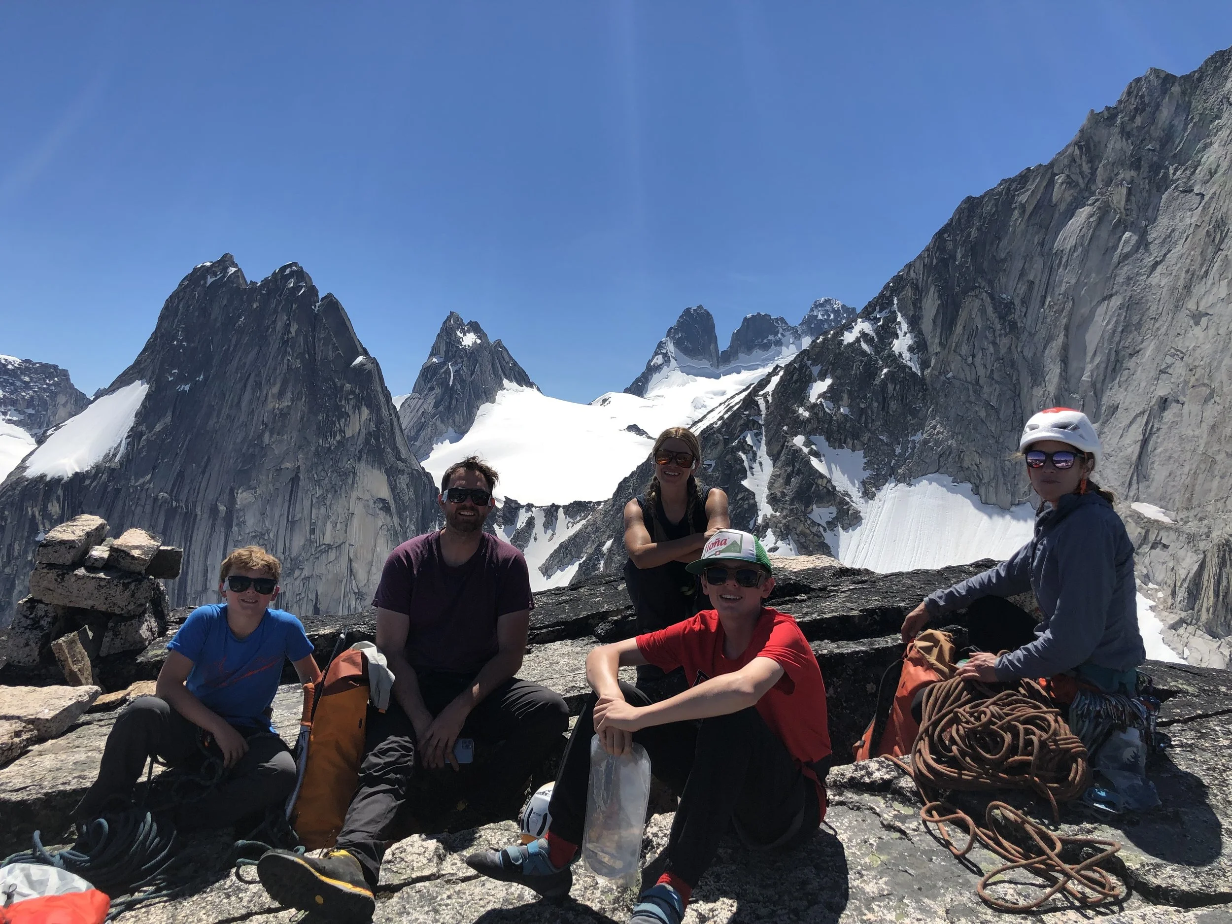 A family relaxes with one of their guides atop North Crescent Spire